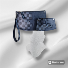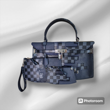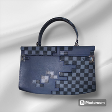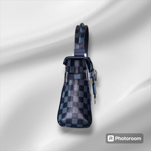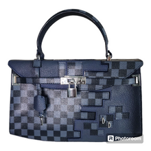 A luxurious handbag in blue grey and black checkerboard leather with silver hardware with lock and key. Fully lined in a silver grey durable lining. A zippered pocket, pouch and key ring holder. Complimented with a matching make up pouch and coin purse with an interchangeable strap. W-13",H-12" with handle, D-3.5". Classic, timeless and chic in a complete package.